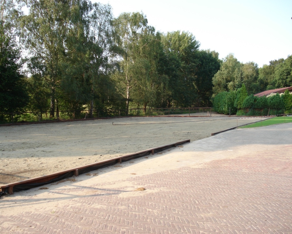 De bak is aangelegd met grof IJsselmeerzand. De bodem van de bak bestaat uit fijn rivierzand wat de ondergrond heel mooi vlak en stevig maakt. Een genot voor ieder paard om op te lopen.!!!!